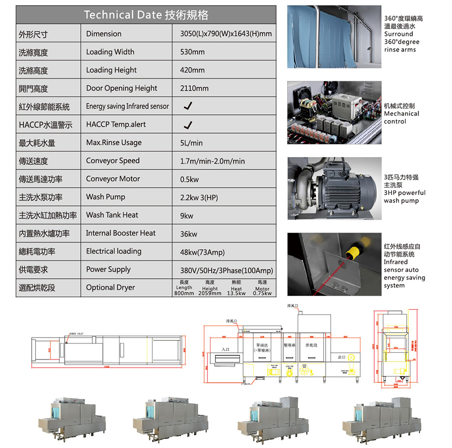 (17)输送带配置CE认证变频控制系统,最后段具有碰触开关,防止餐具掉落,同时履带型式采爪钉形美规设计,驱动马达配备微动停止开关,当输送带卡住时立即停止保护机器。
